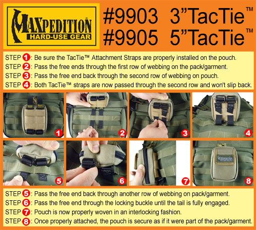 - Maxpedition’s patent pending TacTie™ Attachment Strap system is