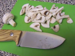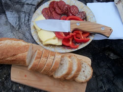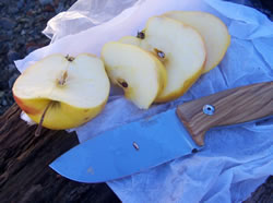 Of course I have pressed the M3 into kitchen service as well. In this front I have found the only limiting factor was the relatively short blade. This knife has a 5mm thick blade. But because it is wide and has a full flat grind, the angle of the primary grind is shallow and "sharp", thus it exhibits very respectable slicing abilities with minimal splitting tendencies. And I took a few photos of some food slicing and dicing in the kitchen and out of doors.