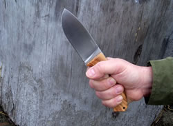 The fit and finish on this midsized knife (and its sheath) is superb. Excellent workmanship and quality is written all over it. This was obvious as soon as I handled it. The knife feels good in the hand, it has good balance and a good heft without being too heavy. It is stout, robustly built and it has a full broad tang construction. The balance point of the knife is just about at the first screw in the handle. The olive wood (Santos wood and black Micarta is available as well) handle panels are fastened by Torx T8 stainless steel screws and have a nice surface texture done with a 3D milling machine. This generously sized handle has a lanyard hole, palm-swells, integrated finger-guard and a very ergonomic shape, all of which provide a comfortable and secure hold. Here are a few "in hand" photos with and without gloves in various grips.