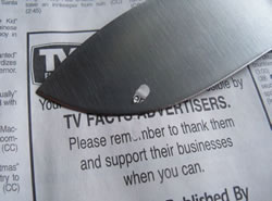 I used newsprint for paper in this test regime. In the following picture I cleanly sliced off letters of a word from the page without breaking through the paper. I think that demonstrates well the sharpness of the edge and how nimble this knife really is.