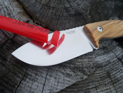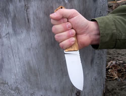 The fit and finish on this midsized knife (and its sheath) is superb. Excellent workmanship and quality is written all over it. This was obvious as soon as I handled it. The knife feels good in the hand, it has good balance and a good heft without being too heavy. It is stout, robustly built and it has a full broad tang construction. The balance point of the knife is just about at the first screw in the handle. The olive wood (Santos wood and black Micarta is available as well) handle panels are fastened by Torx T8 stainless steel screws and have a nice surface texture done with a 3D milling machine. This generously sized handle has a lanyard hole, palm-swells, integrated finger-guard and a very ergonomic shape, all of which provide a comfortable and secure hold. Here are a few "in hand" photos with and without gloves in various grips.