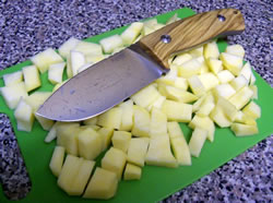 Of course I have pressed the M3 into kitchen service as well. In this front I have found the only limiting factor was the relatively short blade. This knife has a 5mm thick blade. But because it is wide and has a full flat grind, the angle of the primary grind is shallow and "sharp", thus it exhibits very respectable slicing abilities with minimal splitting tendencies. And I took a few photos of some food slicing and dicing in the kitchen and out of doors.