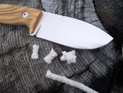 Making feather-sticks from different kind of wood is an important part of fire preparation and I think it is an excellent practice to get a feel of the blade. This task was very easily accomplished with the help of the sharp, full flat grind blade. I have made a few pictures of some of these nice, thin and curly feather-sticks.